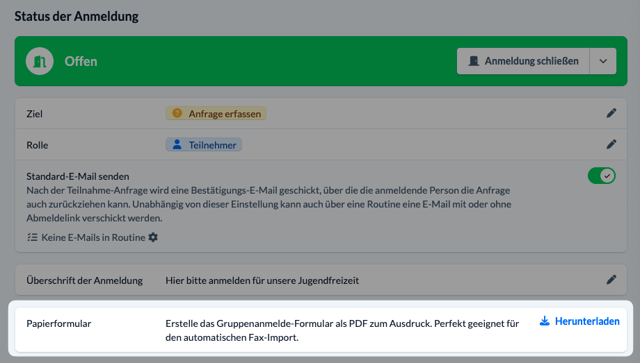 Wir gehen aber noch einen Schritt weiter. Damit die automatische Erkennung der Formulare problemlos von der Handschrifterkennung ausgelesen werden kann, helfen wir euch, das passende Formular auszudrucken. Der Gruppenleiter kann in seiner Gruppe unter Einstellungen > Anmeldung direkt das passende Papierformular als PDF erstellen und ausdrucken.
