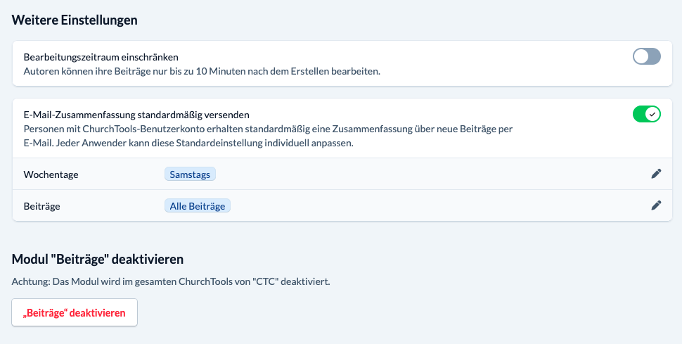 - In den Moduleinstellungen kann jetzt eingestellt werden, an welchen Wochentagen die E-Mail-Zusammenfassung über neue Beiträge standardmäßig versendet werden soll und für welche Beiträge.