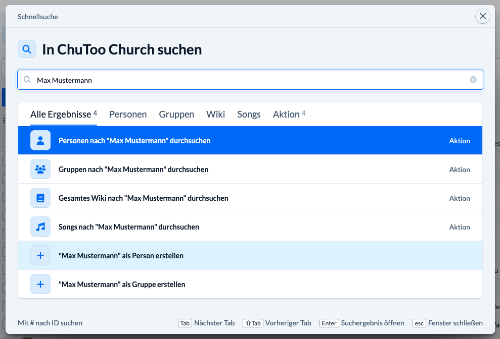 Die Schnellsuche macht ihrem Namen wirklich alle Ehre. Denn schneller kann man zu einer Person oder einer Gruppe nicht navigieren. Es sind auch bereits einige Aktionen in der Schnellsuche zu finden, die dich umgehend zu bestimmten Orten in ChurchTools bringen.