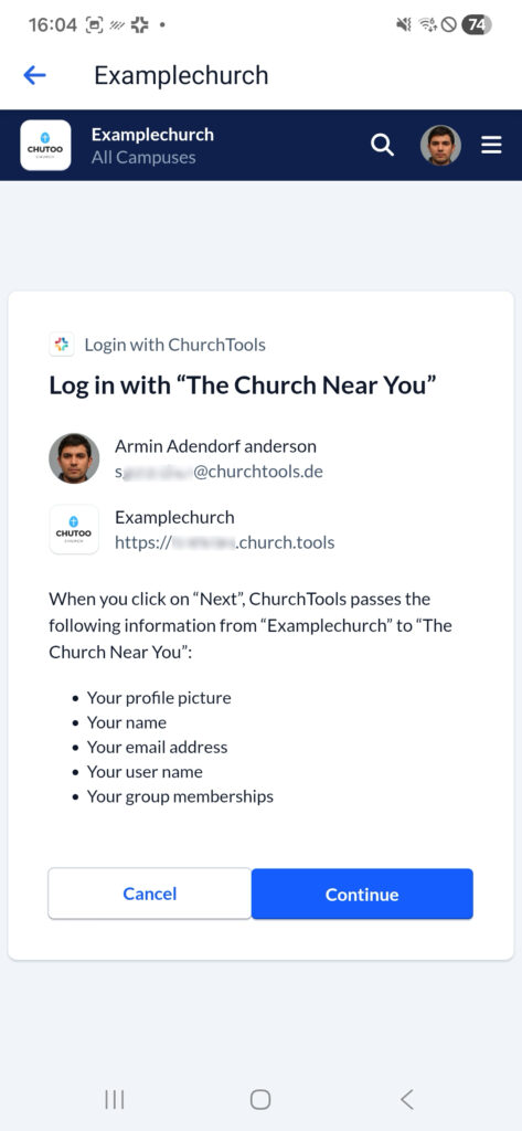 When you click on a link to your own ChurchTools system in the app, it will now open in the in-app browser, provided the app does not have a native display for the page. The big advantage is that you are automatically logged in and do not have to log in again. This allows you to access the information you want more quickly—for example, if you want to open a detail page from a message.
